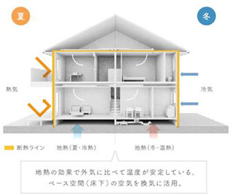 断熱は基礎内部まで覆う「家まるごと断熱」を採用し、北海道のZEH基準に相当する性能を実現。窓にはアルミ樹脂複合サッシを用いたほか、24年11月に住宅業界で初めて花粉問題対策事業者協議会の「花粉対策製品認証」を取得した全館空調「エアロハス」と「エコナビ搭載換気システムHEPA+」を搭載。花粉やPM2・5にも対応する。