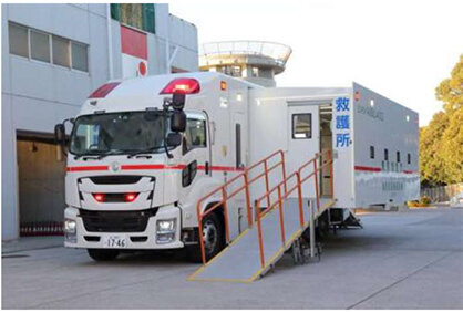 商業施設は火がはなたれ、そこには救助を待つ人がいた。今度は消防隊の出番。消防隊は消火活動と救助活動を同時に進め、けが人を無事運び出しストレッチャーに乗せて完了。並行して日本橋消防団が放水消火訓練を行った。そこに多くのけが人の救護ができる大型救急車「スーパーアンビュランス」が到着して、一連の訓練は終結した。
