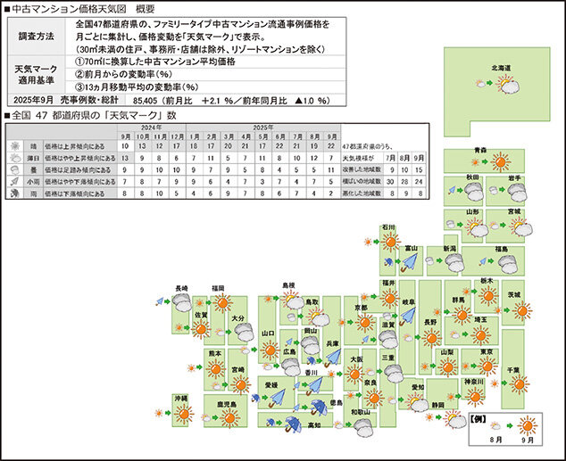 前月と比較可能で事例数10以上の全国516市区町村のうち228都市(44・2%)で価格が下落し、前月の231都市からエリア数、割合ともにやや減少した。9月は首都圏全域で価格が上昇し1都3県すべてが「晴」となった。北関東や九州・沖縄地方は前月に続き多くの地域で好天を維持した。地方主要4道県では3カ月連続で価格が下落している広島県の天気が「薄日」から「曇」に悪化した。