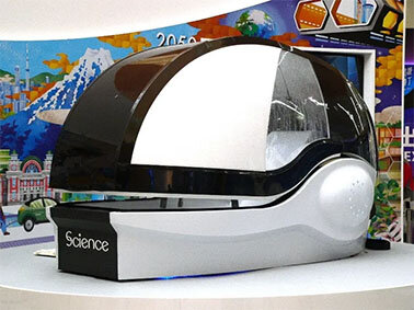 ミライ人間洗濯機は、2025大阪・関西万博で展示されたサイエンス社の製品。ウルトラファインバブルとマイクロバブルが石けんを使わずとも毛穴の奥の汚れや皮脂を除去する。