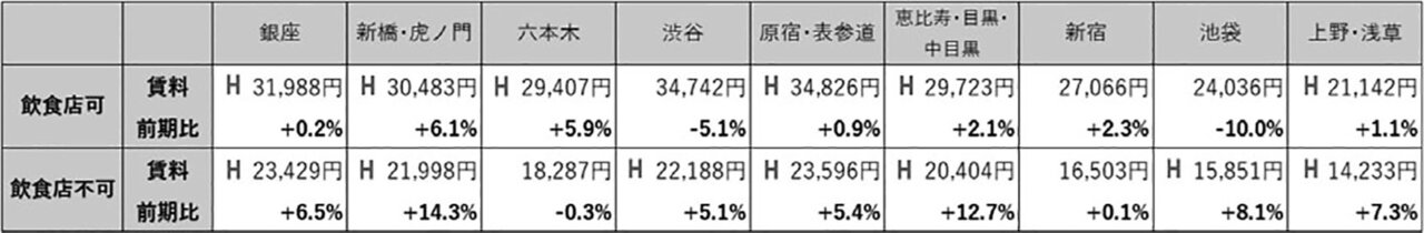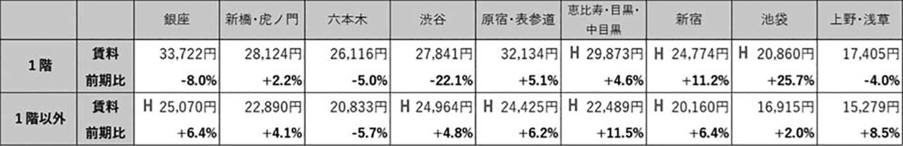 エリア別で18年上期以降最高値を更新したのは、「飲食店可」で6エリア、「不可」で7エリア、「1階」は3エリア、「1階以外」は5エリアという結果だった。