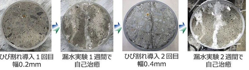 強アルカリ環境下でも代謝活動が可能な強アルカリ耐性菌「AH株」を用いたバイオスマートコンクリートは、ひび割れを自己治癒し鉄筋の腐食を防止する効果を持つ。漏水実験でも繰り返し導入したひび割れの閉塞を確認した。