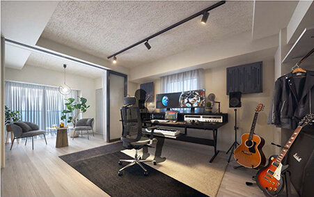 間取りは1K、2Kで専有面積は28~40m2。全戸二重サッシを採用するなどした防音仕様で、遮音性能目標値は80デジベル。クリエイターが創作活動に集中できる設備を整えた”住むスタジオ”のような住空間を提案し、時間を気にせず音楽制作などに専念できる。