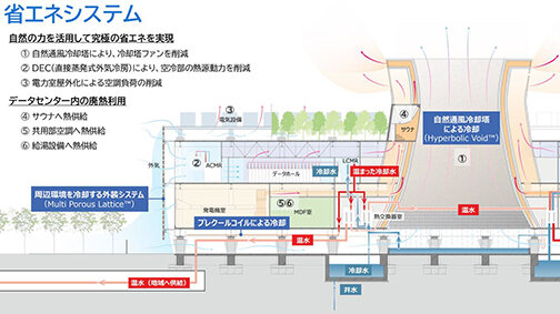 サーバーから発生する廃熱を周辺の住宅やオフィス、ビニールハウス、温浴施設などへ供給し、地域のエネルギー循環に活用する。建物内部には自然通風による冷却効果を持つ大規模排気塔を設け、廃熱を中央に集約し効率的に冷却する。これによって、冷却に必要な電力を削減し、従来の冷却システムと比較して50%以上の省エネルギーと周辺環境への熱影響の低減を両立する。