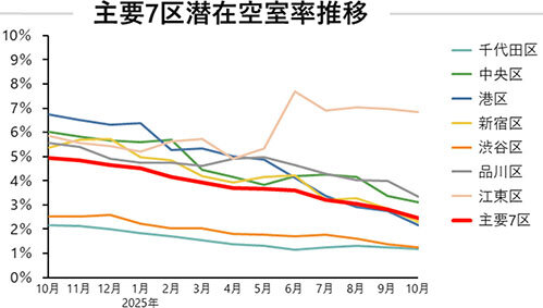 潜在空室率は主要7区全ての区で低下し、主要5区・7区ともに14カ月連続で低下。特に品川区の潜在空室率は、60カ月ぶりに3%台まで低下した。