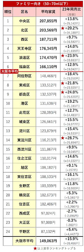 上位6区はシングル向きと同様で、大阪市平均家賃を上回ったのは上位6区だけだった。