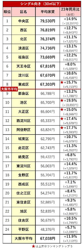 タイプ別では、シングル向けマンションの賃料は24区すべてで上昇。賃料水準が高いのは中央区や西区などの大阪都心部で平均家賃は7万円台後半。