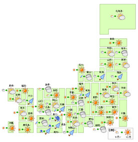 10月は「晴」が22から18地域に、「雨」は2から1地域に、「曇」は11から9地域にそれぞれ減少した。「薄日」は7から11地域に、「小雨」は5から8地域に増加した。全国で天候が改善した地域数は15から9地域に減少、横ばいは24地域で変わらず、悪化は8から14地域に増加。47都道府県のうち前月比価格が下落したのは13から18地域に増加した。前月と比較可能で事例数10以上の全国515市区町村のうち219都市(42・5%)で価格が下落し、前月の228都市(44・2%)からエリア数、割合ともにやや減少した。