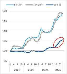 (2)は、家賃高騰で東京23区の安価な物件に注目が集まった。24年半ばまでは築20年までの物件の家賃は上昇していたが「30年超」の賃料にはあまり変化はなかった。しかし(1)の家賃上昇を背景に築30年超でも上昇幅の拡大などが見られた。