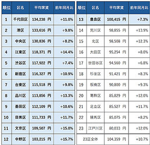 (1)では、5月に初めて23区のシングル向きマンションの平均家賃は10万円を超えた。その後、上昇が続き9月まで16カ月連続で15年1月以降の最高値を更新した。9月時点で平均家賃が10万円を超えたのは23区中13区だった。