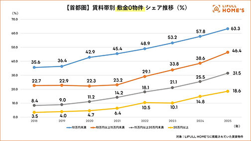 礼金ゼロ物件は前回調査より全賃料帯で増加。「10万円未満」が46・7%と最も多く、「20万円以上」物件は10・9ポイントも増加し42・3%となった。