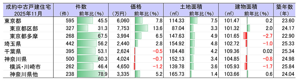 中古戸建ての成約件数は1932件(前年比53・1%増)と24年11月から13カ月連続で増加。価格は4002万円(同2・7%上昇)で2カ月連続で上昇した。