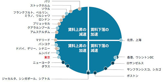 昨今勢いのある大阪と比べると「順調」とは言い切れない側面もある。24年に竣工したランドマーク物件のリースアップは、意外にも足踏みしている期間が長く、26年竣工の新築物件についても、決して悪いとは言えないものの勢いが欠けていると同社は指摘する。中期的には、Aグレードオフィスの賃料は弱まりが予想される一方、Bグレードオフィスは堅調で、賃料も順調に上がってきている。
