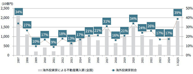20年からはコロナ禍でオフィス市場の先行きも不透明になったが、近年はオフィス回帰が進み、海外の投資家を含め、25年は特に日本のオフィスへの投資が加速している状況だ。日本不動産への投資額のピークはリーマンショック前の07年だったが、25年第3四半期の海外投資家の割合は39%と、07年の34%を上回っている。
