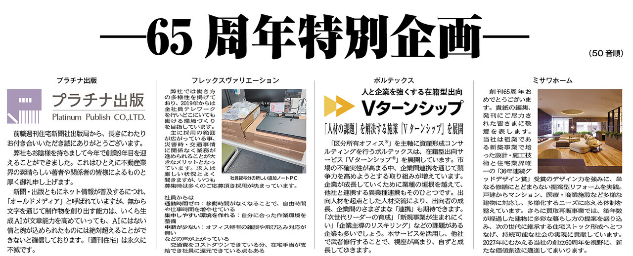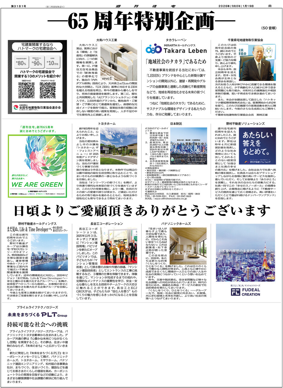 創刊65周年おめでとうございます。貴紙の編集、発刊にご尽力された皆さまに敬意を表します。当社は祖業である新築事業で培った設計・施工技術と住宅業界唯一の「36年連続グッドデザイン賞」受賞のデザイン力を強みに、単なる修繕にとどまらない提案型リフォームを実践。戸建からマンション、医療・商業施設など多様な建物に対応し、多様化するニーズに応える体制を整えています。さらに買取再販事業では、築年数が経過した建物に多彩な暮らし方の提案を盛り込み、次の世代に継承する住宅ストック形成へとつなげ、持続可能な社会の実現に貢献しています。2027年にむかえる当社の創立60周年を視野に、新たな価値創造に邁進してまいります。