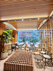 「REVZO新橋」は、竹中工務店との共同開発でCLT(直交集成板)とデッキプレートを一体化させた「CLT合成床」を採用した。これにより床のコンクリート厚を減らして建物全体を約4%軽量化し、脱炭素にも寄与する。また、900㍉ピッチのスリットを設けることで木の天井を傷つけずにテナントが間仕切りを変更できる工夫も施した。