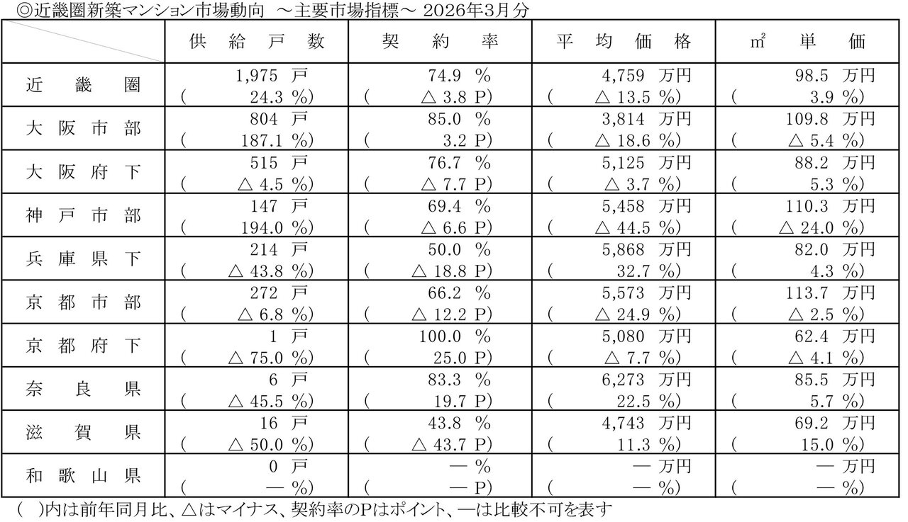 一方、近畿圏の発売戸数は1975戸(前年比24・3%増)、価格は4759万円(同13・5%下落)と2ケタ下落したが、面積の狭い投資用物件の供給が多かったことが影響した。1m2単価は98・5万円(同3・9%上昇)だった。